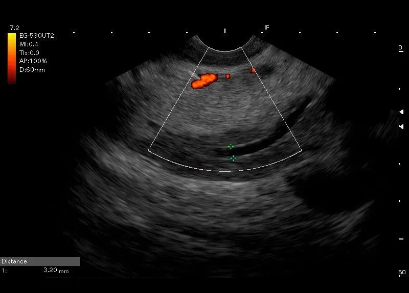 Widoczna w głowie trzustki różnica echogenicznoczności o charakterystycznym położeniu i kształcie - zawiązek brzuszny i przewód Wirunga