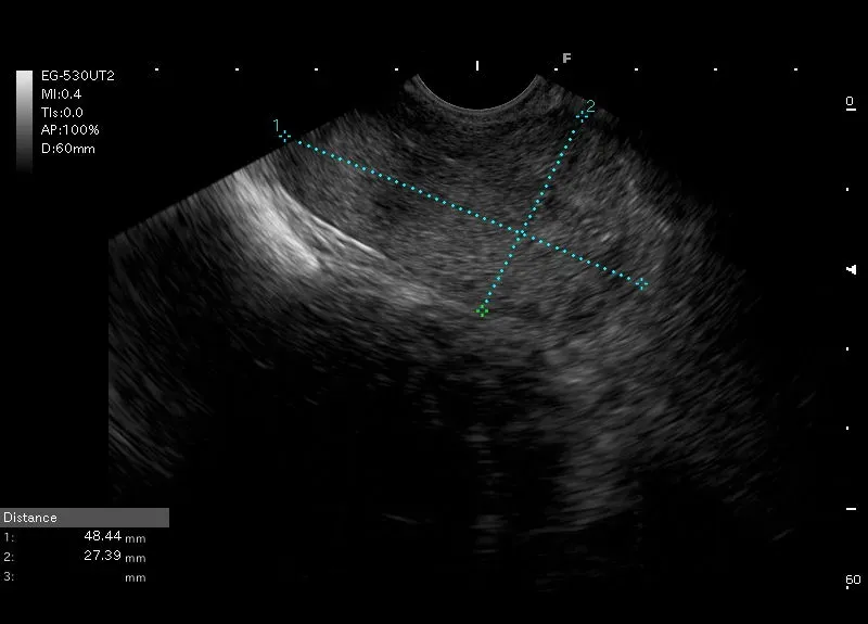 Niejednorodna zmiana przylegająca do lewego płata wątroby i żołądka, bez wyraźnej granicy z miąższem wątroby.