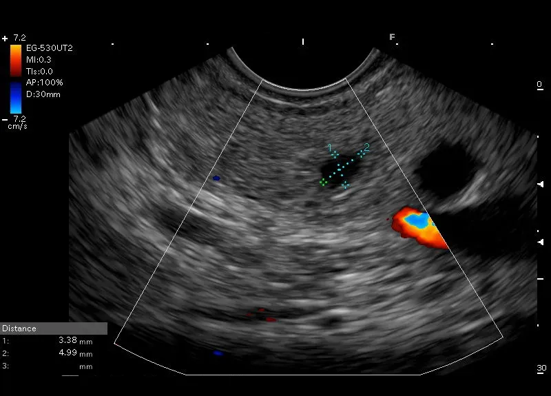 Położona w trzonie trzustki drobna, około 4 / 5 mm bezechowa przestrzeń o wyraźnych granicach, bez struktur wewnętrznych i bez przepływu naczyniowego widocznego w opcji Doppler-drobna torbiel trzustki