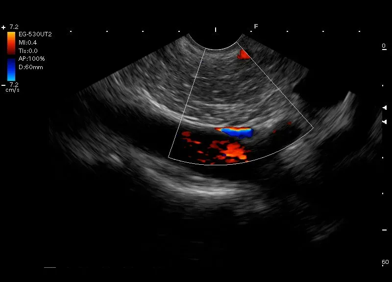 Drobne, linijne, hiperechogeniczne odbicia, bez cienia akustycznego, widoczne w trzonie trzustki - zmiany mogące odpowiadać zwłóknieniom w trzustce