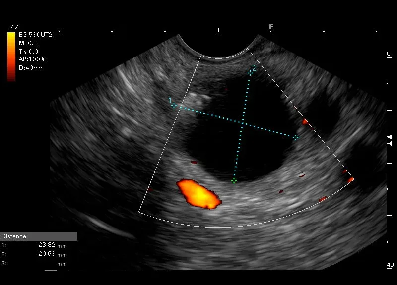 Widoczna w dystalnej części trzonu trzustki bezechowa, owalna przestrzeń o morfologii torbieli z hyperechogeniczną przyścienną strukturą odpowiadająca zwapnieniu przyściennemu.