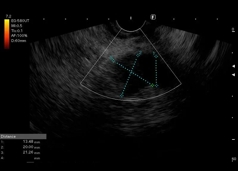 przewodu Wirsunga do 14 mm, tuż za zmianą położoną w głowie trzustki.