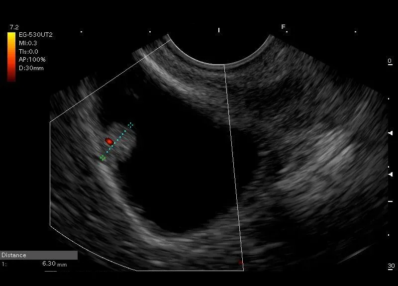 Owalna struktura przylegająca do ściany pęcherzyka żółciowego, z widocznym przepływem naczyniowym w opcji Power Doppler w podstawie zmiany, bez cienia akustycznego, która nie zmieniła swojego położenia podczas próby wstrząsania- polip pęcherzyka żółciowego