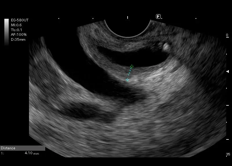 widocznymi w świetle drobnymi, owalnymi i linijnymi hyperechogenicznymi odbiciami z niewielkim” brudnym” cieniem - obraz