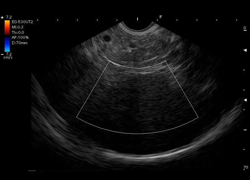 Zobrazowana przez głowice EUS przyłożoną w żołądku - śledziona
