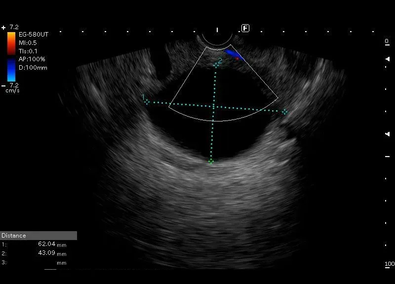i wielkości 60/40 mm, bez widocznego przepływu w opcji power doppler, położona