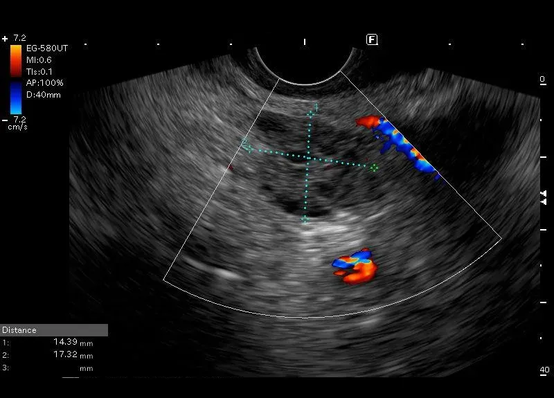 power doppler. Opisana zmian ma wielkości około 18/16 mm. Została odnaleziona u