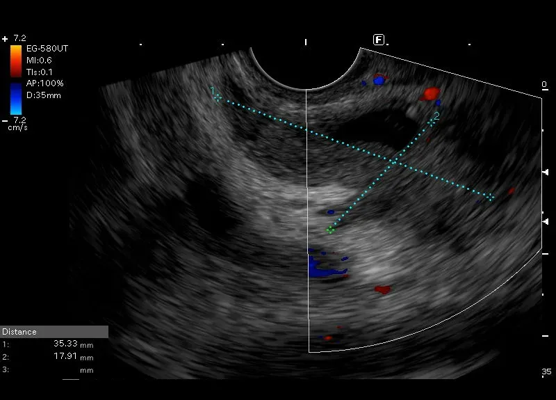 naciekiem około 36/18 mm, o zatartych granicach i obniżonej echogeniczności, przechodzącym