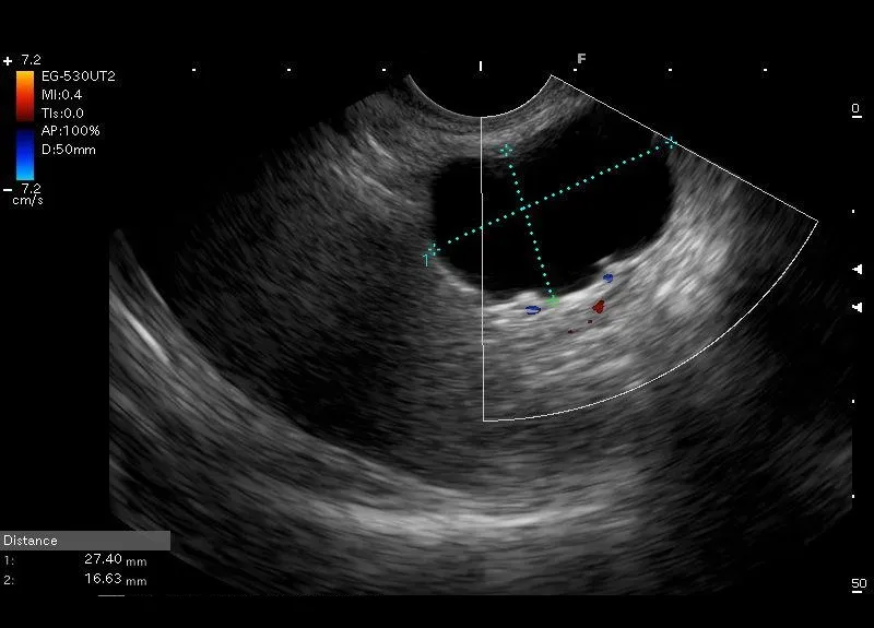 Położona w trzonie trzustki bezechowa przestrzeń o wyraźnie widocznych granicach ( torebka) , bez widocznych w świetle struktur - torbiel trzustki