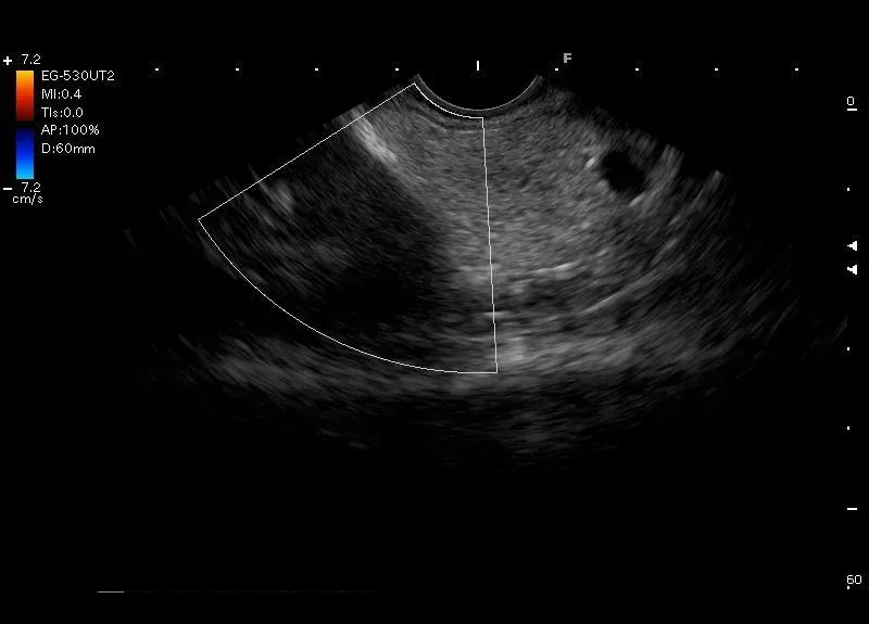 Ogon trzustki zobrazowany przez głowice EUS przyłożoną w trzonie żołądka .Widoczne są także fragment nerki i śledziony.
