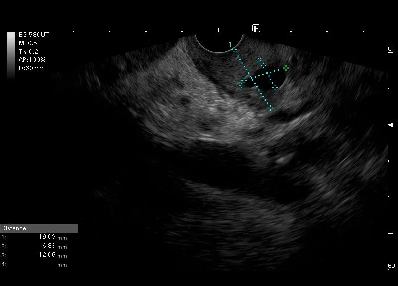 Pogrubiała ściana dwunastnicy z drobnymi torbielami w ścianie - w wybranym przypadku obraz zapalenia bruzdy.