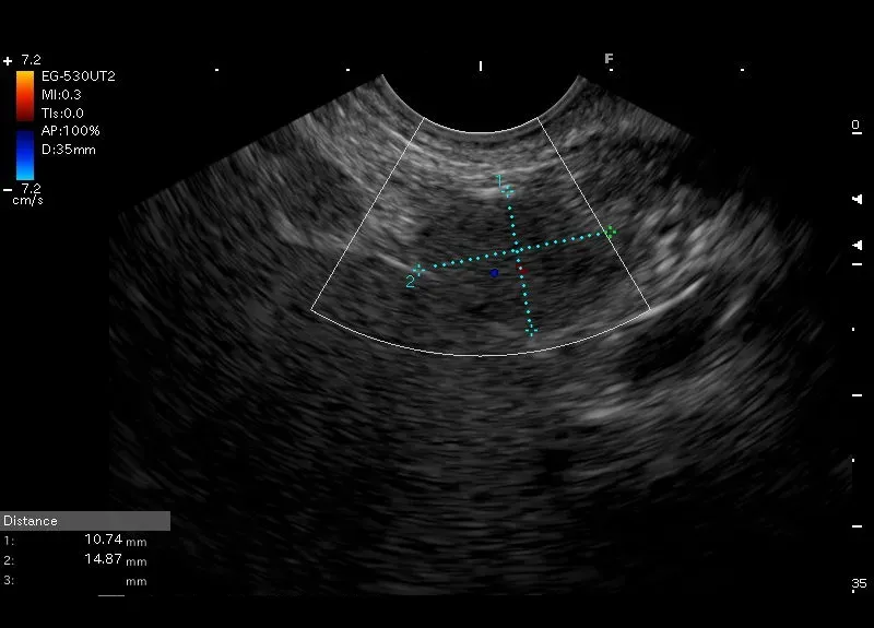 Owalna zmiana wielkości około 11/15 mm o echogeniczności i strukturze zbliżonej do położonej obok śledziony- śledziona dodatkowa